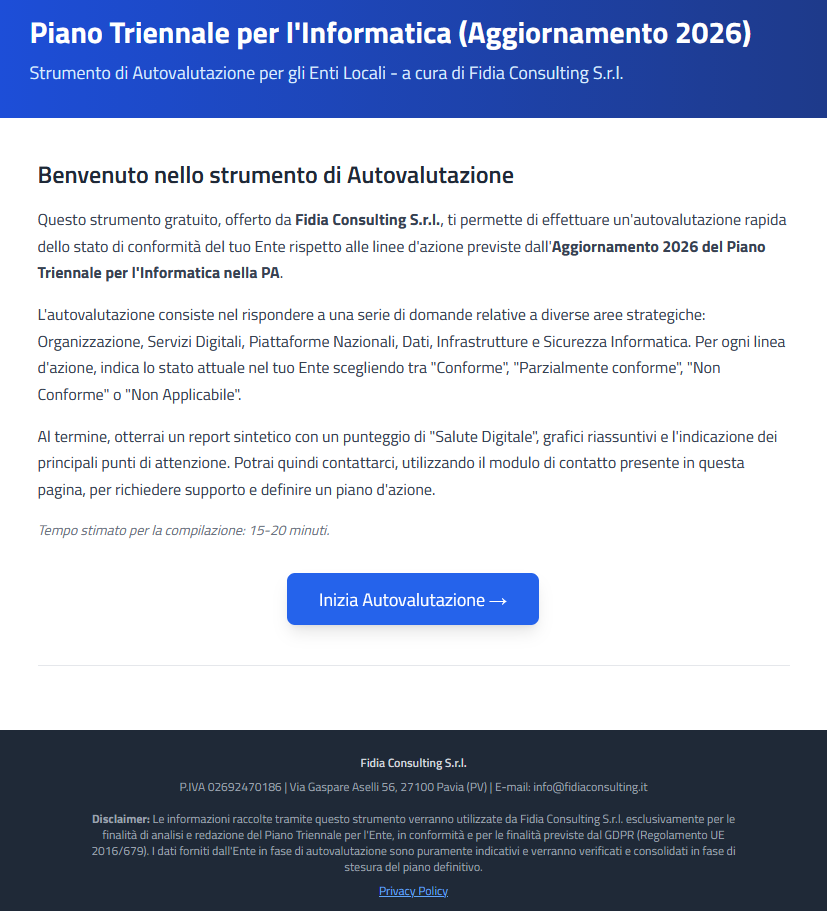 Per questo motivo, in stretta collaborazione con il nostro Main Partner Fidia Consulting S.r.l., abbiamo sviluppato un Servizio gratuito ed anonimo di Autovalutazione dedicato all’Aggiornamento 2026 del Piano Triennale per l’informatica nella PA.