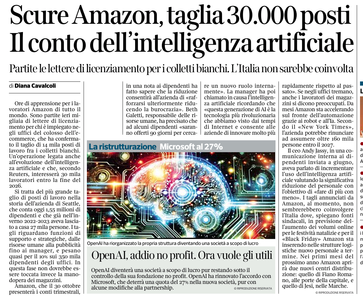 Il recente caso emblematico riportato dalla stampa (Corriere della Sera, 30 ottobre 2025), relativo alla decisione di Amazon di tagliare 30.000 posti di lavoro “white collar” (colletti bianchi) entro il 2026 proprio a causa dell’evoluzione dell’IA, non è un semplice fatto di cronaca aziendale. È il sintomo di una rivoluzione strutturale che tocca il cuore della nostra organizzazione sociale ed economica.